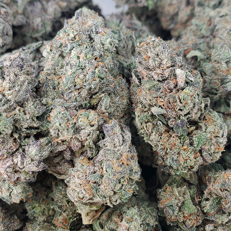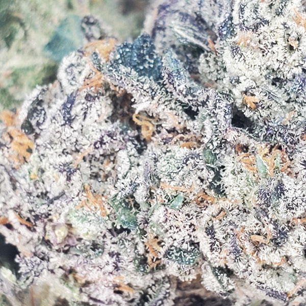 | Appearance | Round forest green in color with bright blue undertones. Each bud is has thin orange hairs and coated with a blanket of tiny crystal trichomes. |